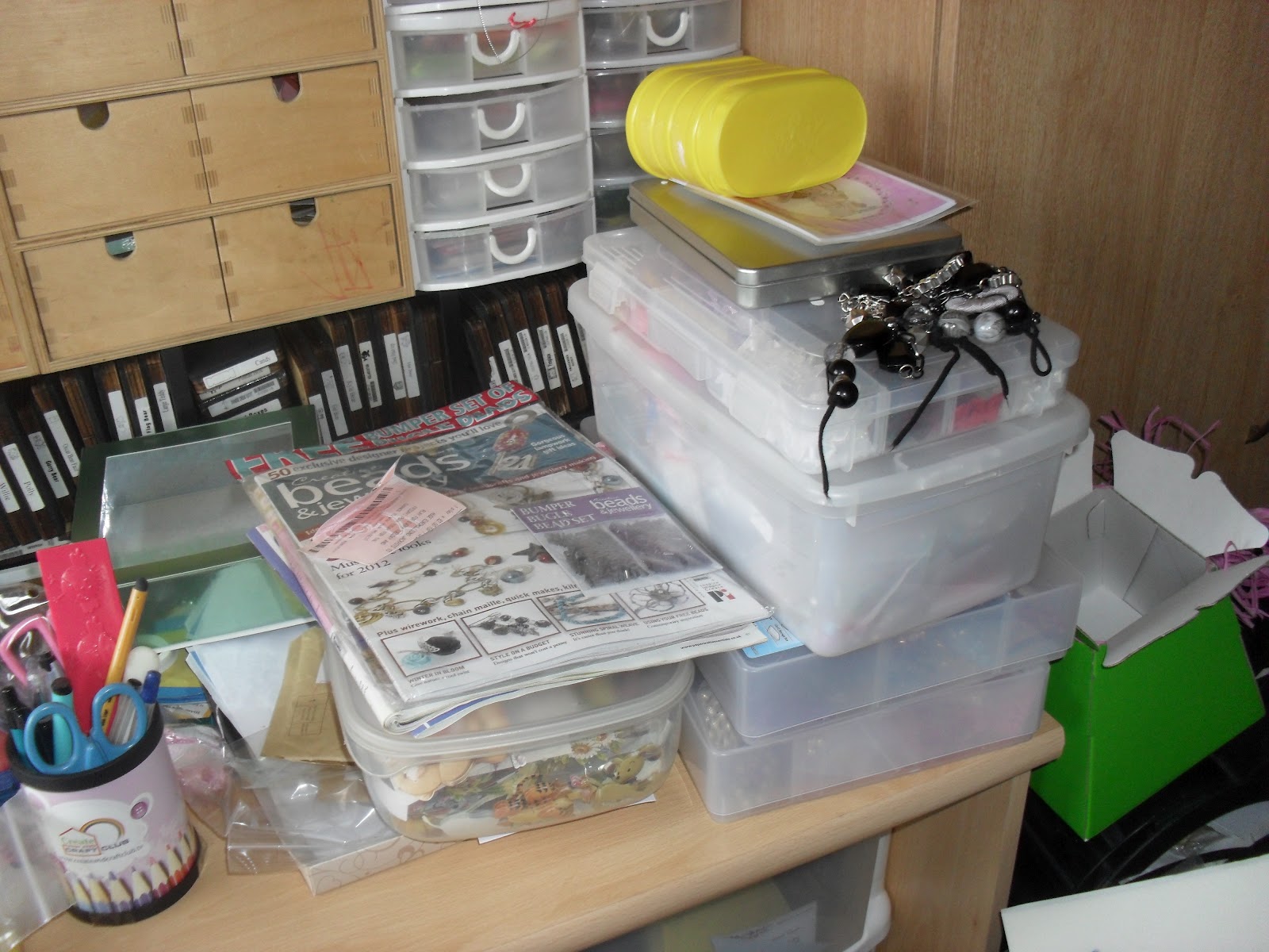 Hello everyone well yes you know its Wednesday again and that means its time for Whats On Your Workdesk Wednesday so do pop on over to Julia's blog to join in the fun. Oh how the week flies by Wednesday's comes around so quick lol. I have been quite busy this week crafting have made a few cards more bears and also some more pins. The first fews pics were taken before I started to tidy up as it was getting to much to keep pushing it back so had to have a bit of a tidy. The odd shaped card which is basket weave in the pic is the packaging from an easter egg and thought it might come in useful for my cards, the gree bowl also has beads in that I haven't found a home for yet. You can also see a few more of my die cutters in the background. I hadn't done much when some new beads caught my eye that were hidden under stuff so of course I had to sit down and make some pins which you can see in the picture they are white faux beads with a lovely red and silver bead in between I quite like how they turned out I have been selling my pins on ebay so it helps to pay for more beads and charms. Well thats enough from me I hope you enjoyed having a look around my craft space and thank you for visiting and any comments you may leave. Now I am off to have a snoop around other people's craft desks.